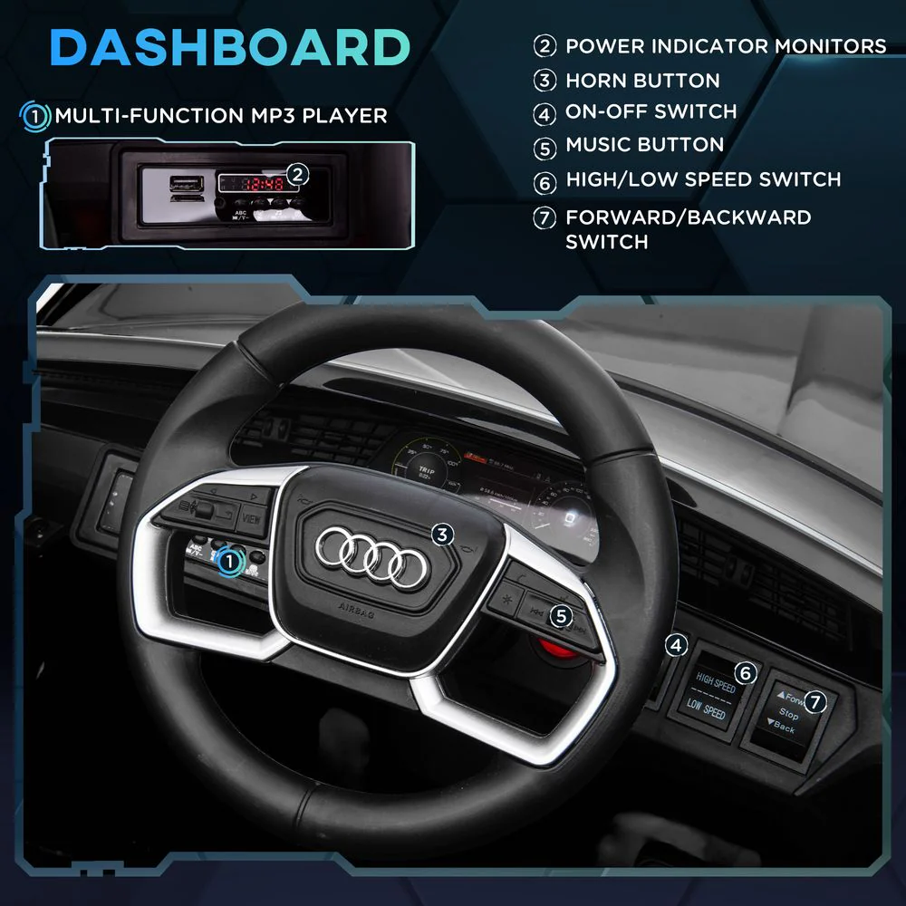 AUDI E-tron RIDE-ON: A licensed Audi E-tron ride-on with LED lights, seatbelt, steering wheel and horn - feels like driving a real car.MANUAL OR REMOTE DRIVEN: Use the steering wheel to navigate the car, which has two speed settings. Or use the remote control to use the ride-on, which has three speed settings.SAFE RIDING: The seatbelt keeps them secure. Four wide tyres for a balanced and smooth ride. Includes 2 small training wheels, it is convenient for parents to transport while battery runs out.DIMENSIONS: 47H x 108L x 60Wcm.MAXIMUM LOAD 25KG. Certificated age: 37-95 months. Recommended age: 37-60 months. 2 x AAA batteries required (not included).